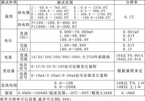 電壓、交流電流、交流功率、功率因素、頻率、電能、溫度、熱電阻(PT100、PT1000)、濕度、